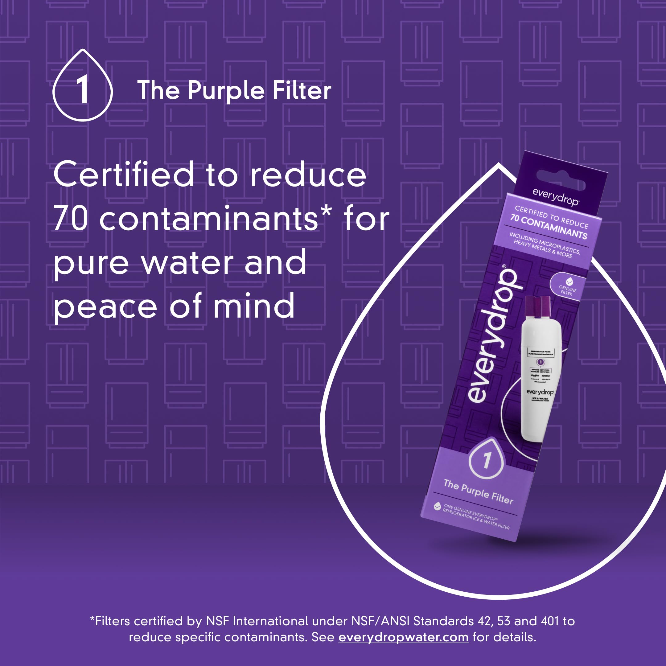 "Certified* to reduce 70 potentially harmful contaminants such as microplastics, heavy metals, pesticides, and pharmaceuticals, everydrop water filters raise the standards for crisp, clean, and refreshing water and ice. *Filters certified by NSF International under NSF/ANSI Standards 42, 53, and 401 to reduce specific contaminants. See everydropwater.com for details."