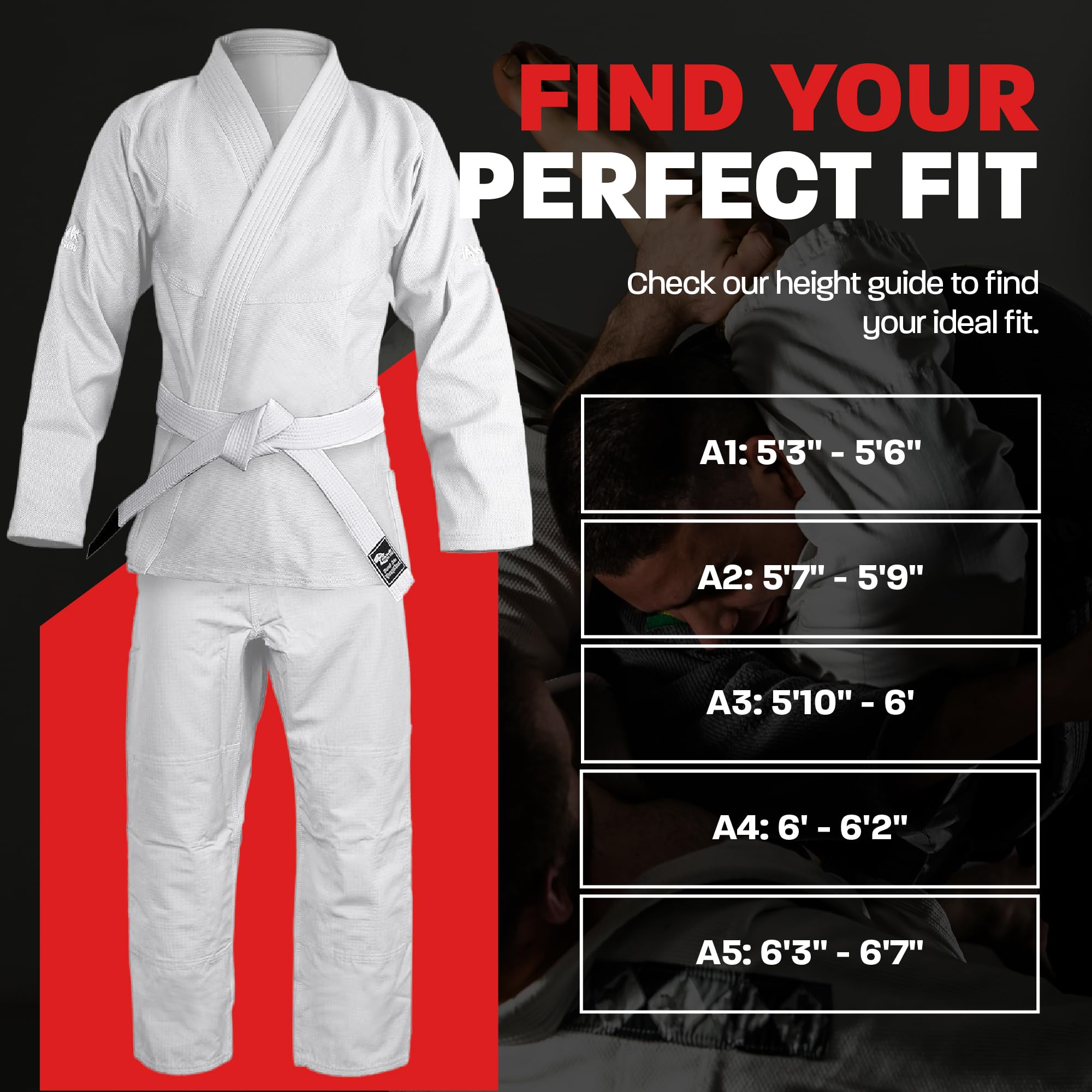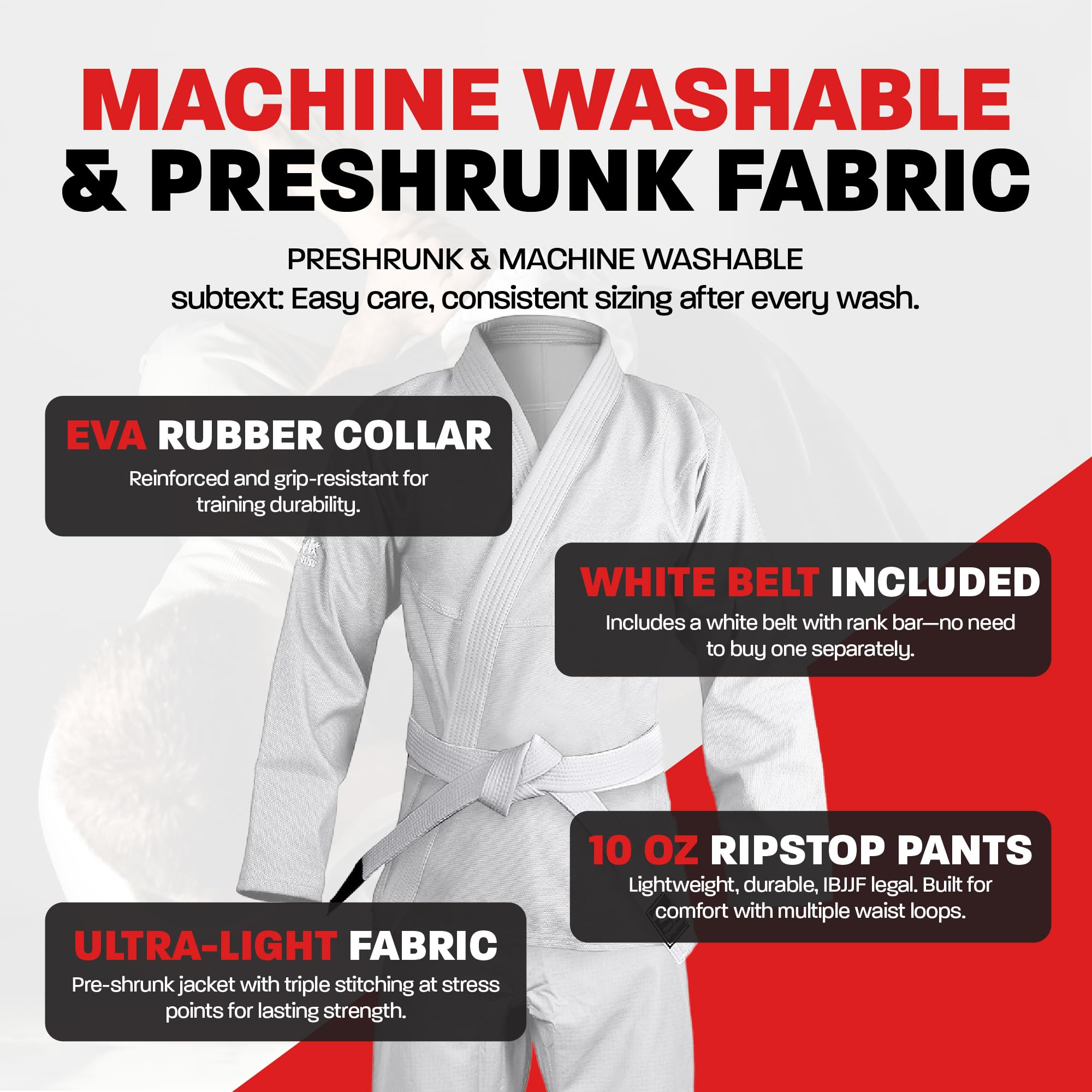 IBJJF-Legal Complete BJJ Gi. Be ready for action right out of the gate with this IBJJF-legal BJJ gi. This set includes a BJJ kimono, BJJ pants, and a BJJ white belt. Perfect for beginners and competitors looking for a reliable, tournament-ready gi.