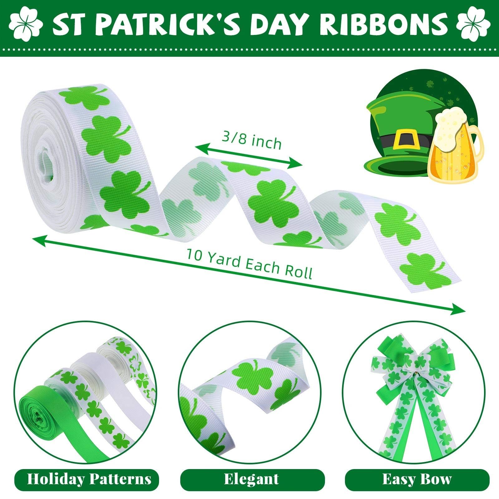 you will get 4 rolls of St. Patrick's Day grosgrain ribbons, 3/8 inch wide and 10 yards long per spool; In classical green and white colors, the shamrock clover print ribbons are long and rich enough to apply for a long time, also you can share them with others