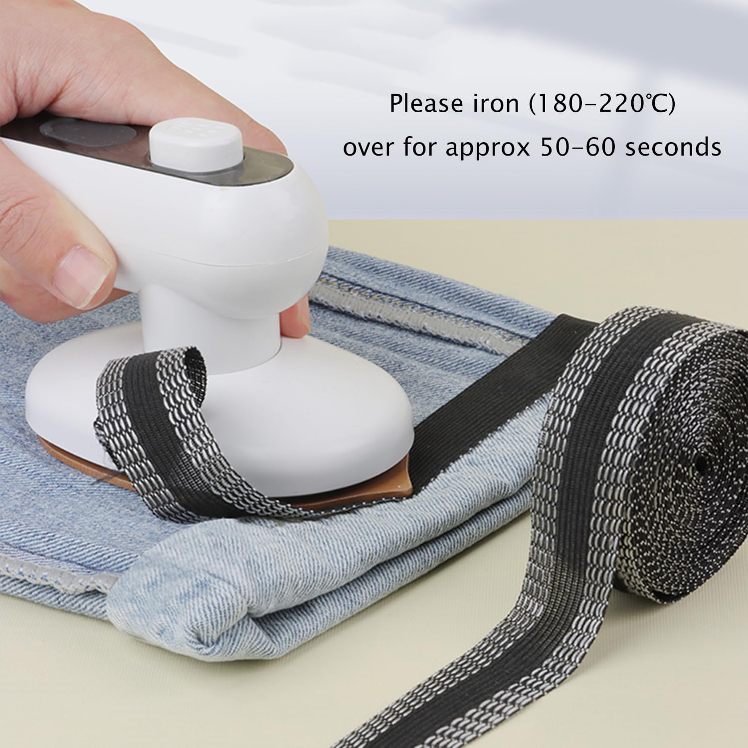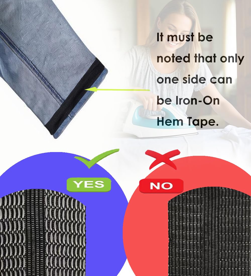【EASY TO USE】Put hem tape in the water, and take out to squeeze out the water. Place the white adhesive strips side on the seam between the trouser leg and the trousers and ironing the sticking area for 10-15 seconds.