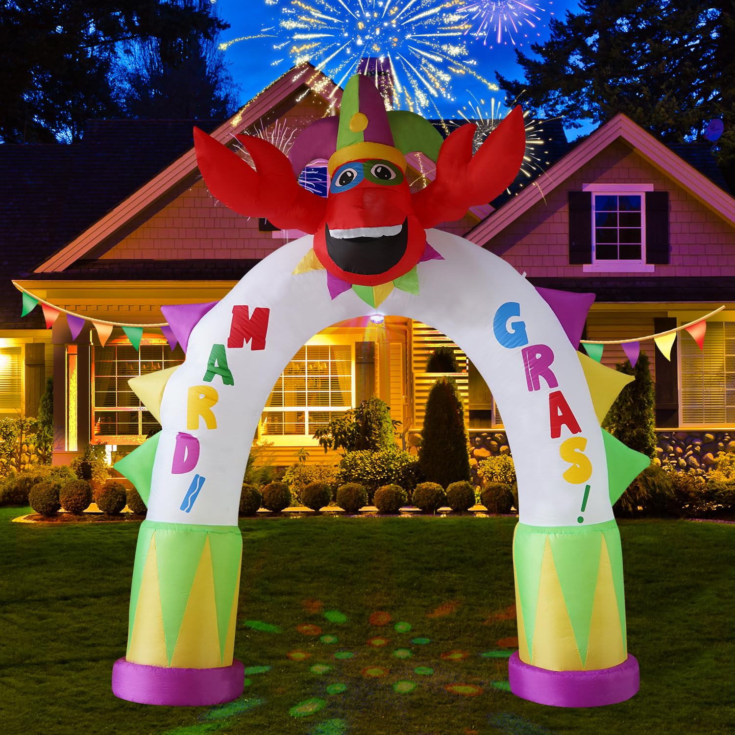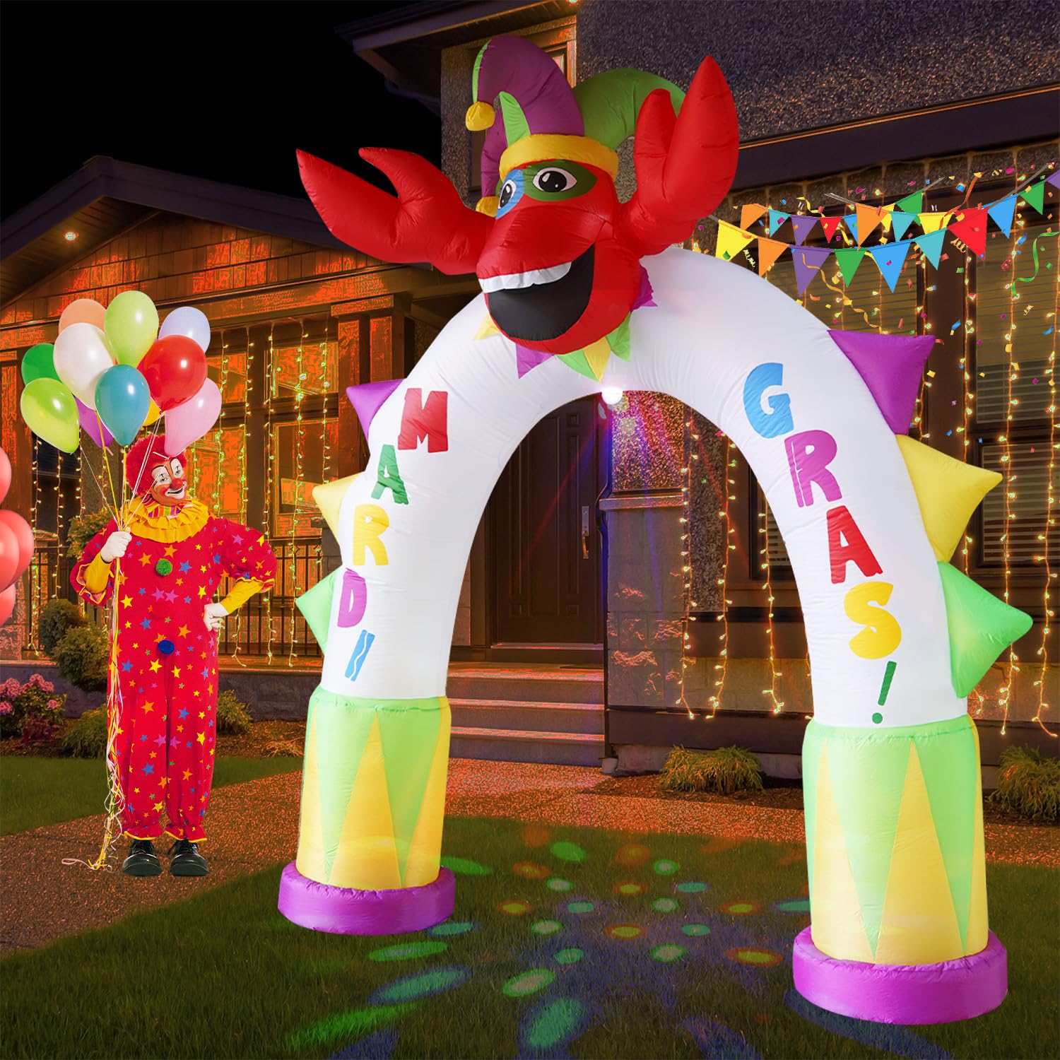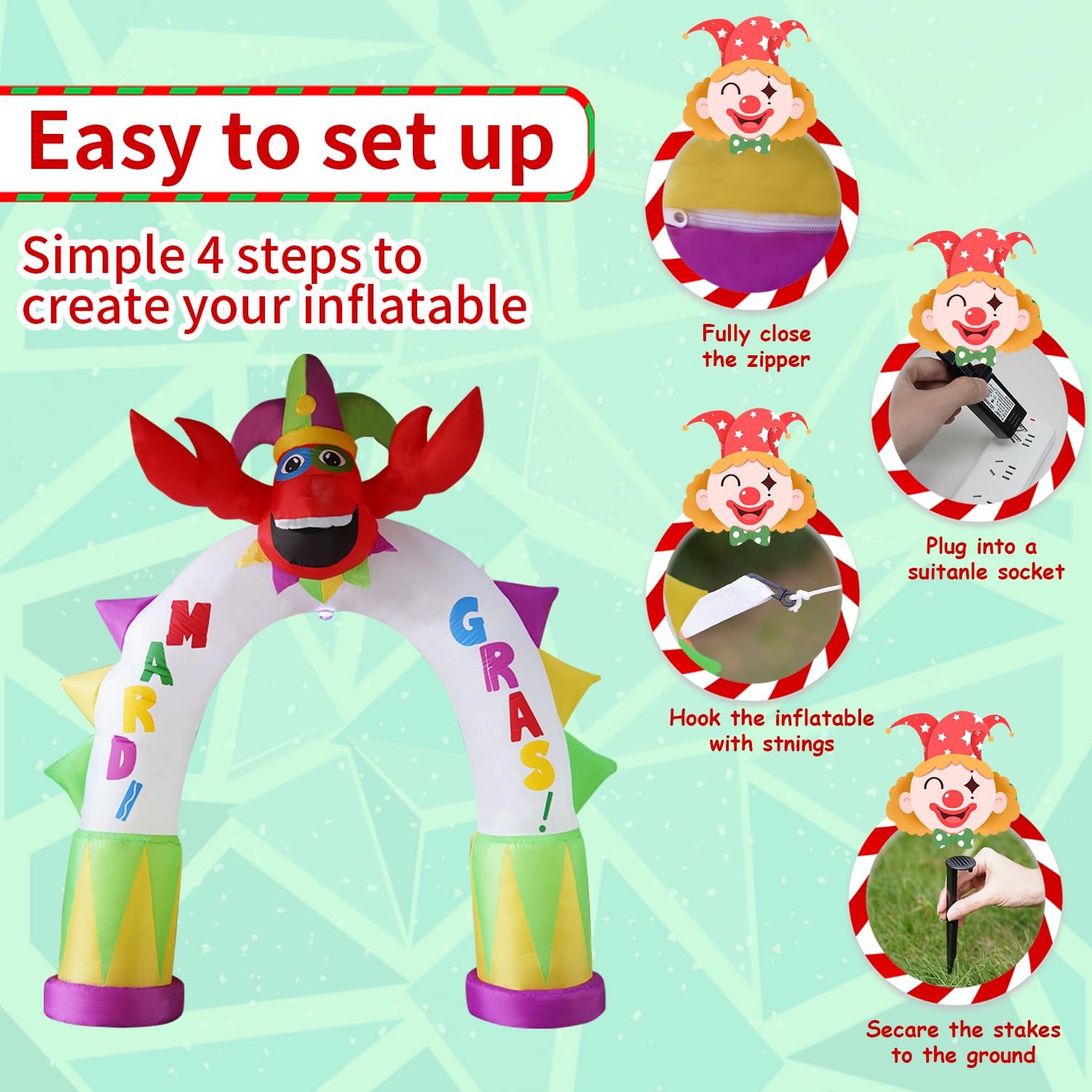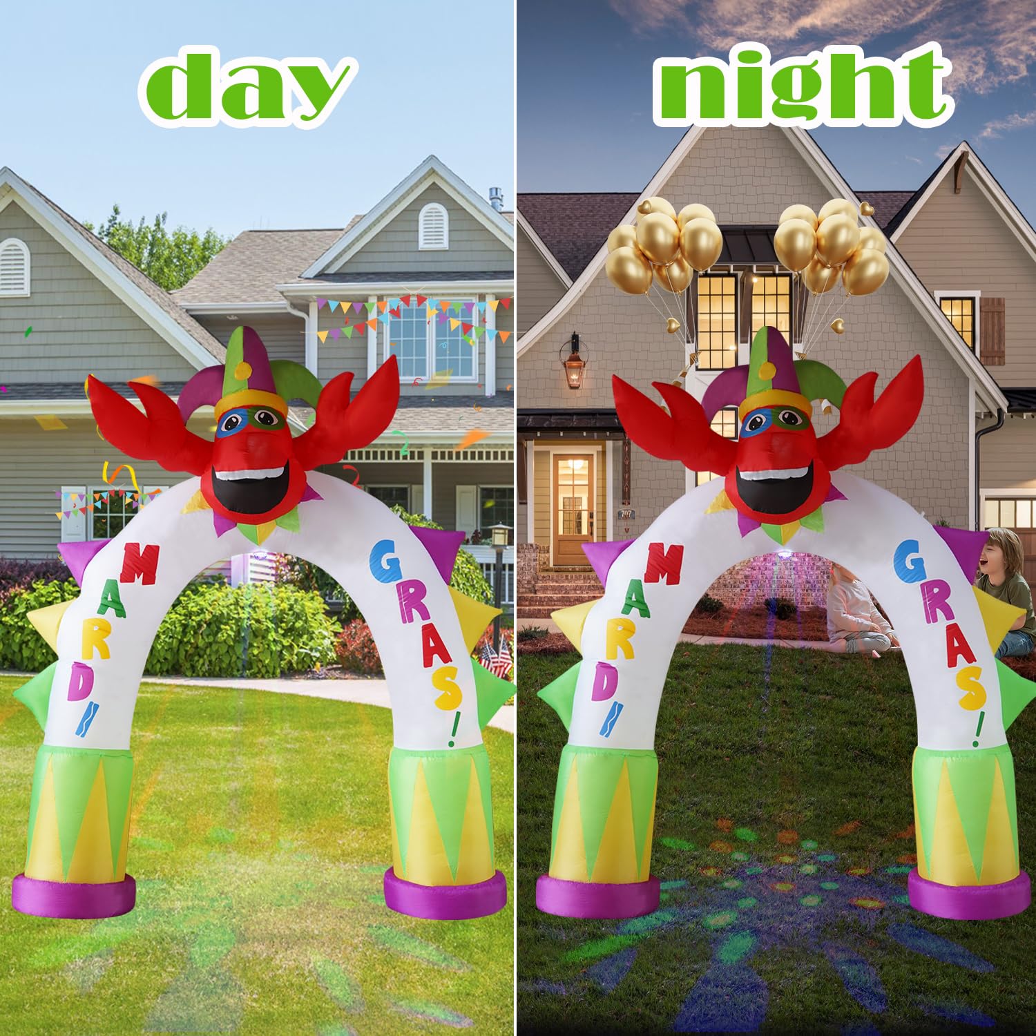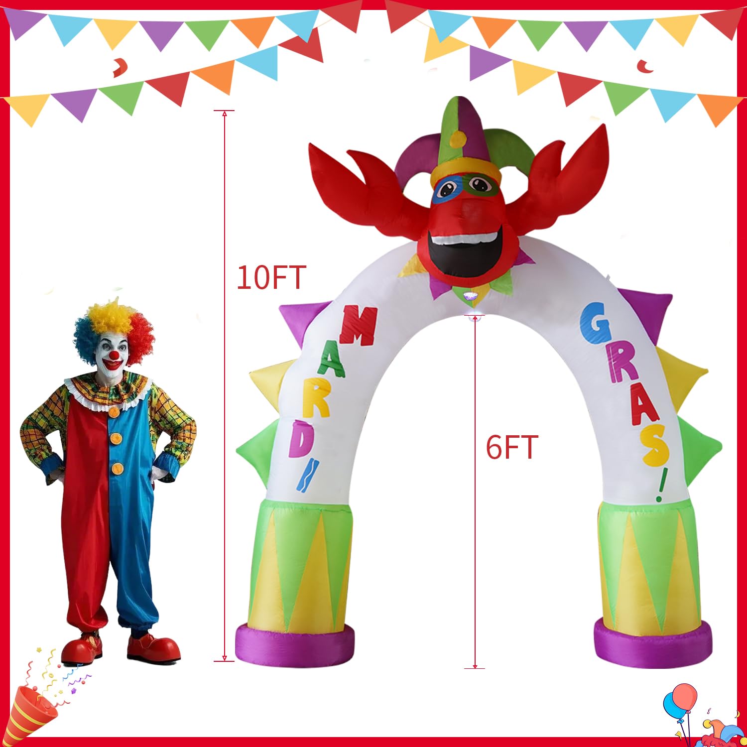 Carnival outdoor inflatable decoration with rotating colorful lights shining down and bright LED lights on the top. This 10FT lobster arch decoration has a lovely and joyful atmosphere. Put it in your garden or yard, it is the best decoration for outdoor patio garden decoration, celebrating carnival events. Everyone sees this inflatable toy from a distance and will be excited to see it up close and in person.