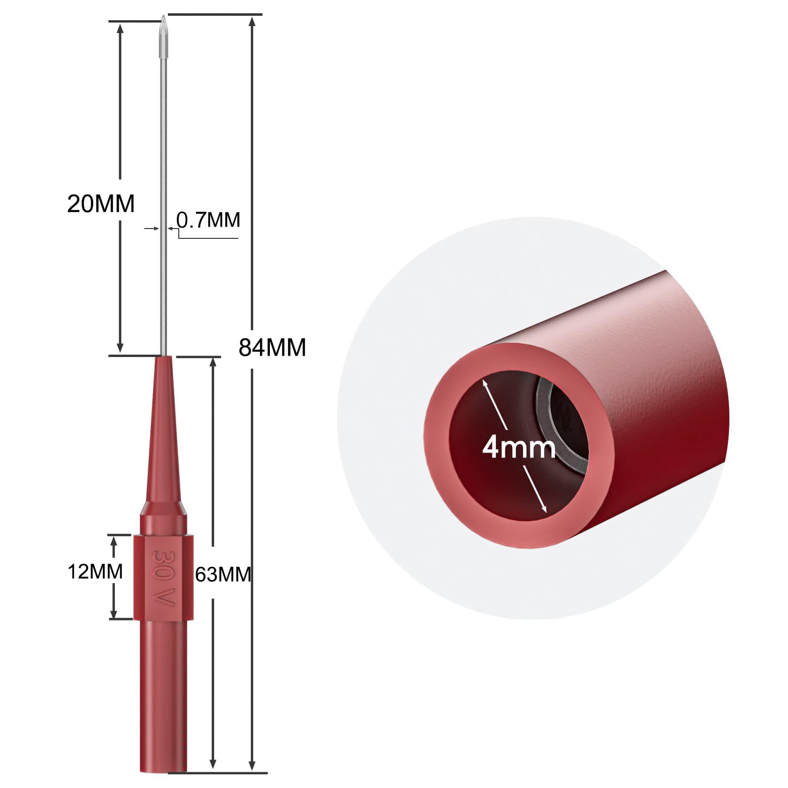 The total length of the Back Probe kit is approximately 8.4cm, and the length of the probe is 2.0cm. The extended version of the probe allows you to test in areas that traditional probes cannot reach. Insulation shell: PA. Pin material: Stainless steel.