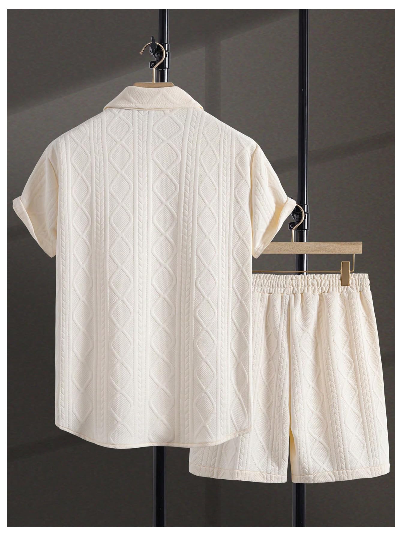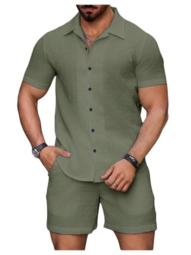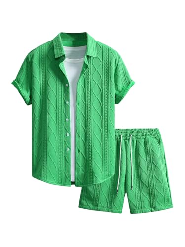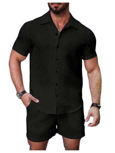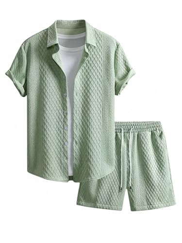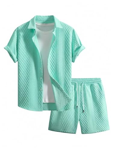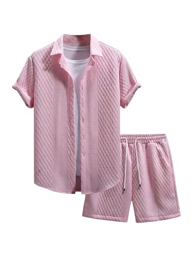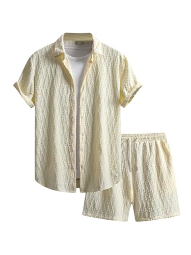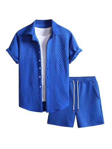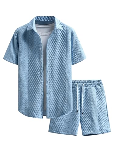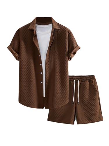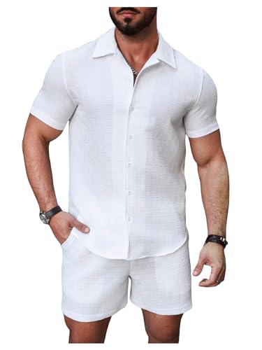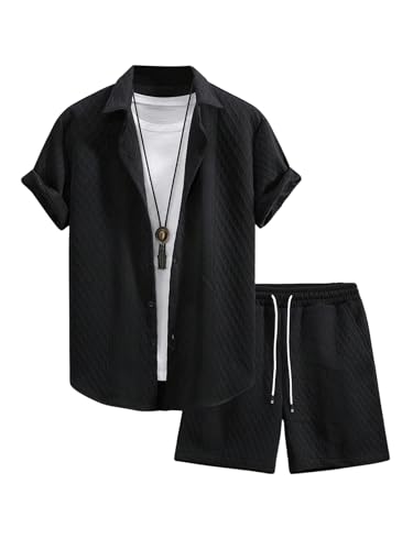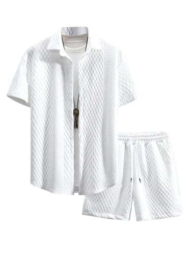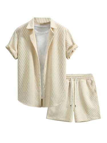 The top in the beach outfits features unique knitting texture, turn down collar, short sleeve, button down closure. The board shorts feature an elasticated drawstring waist and side deep pockets perfect for carrying your phone, keys, sunglasses or cards. Comfortable and stylish.