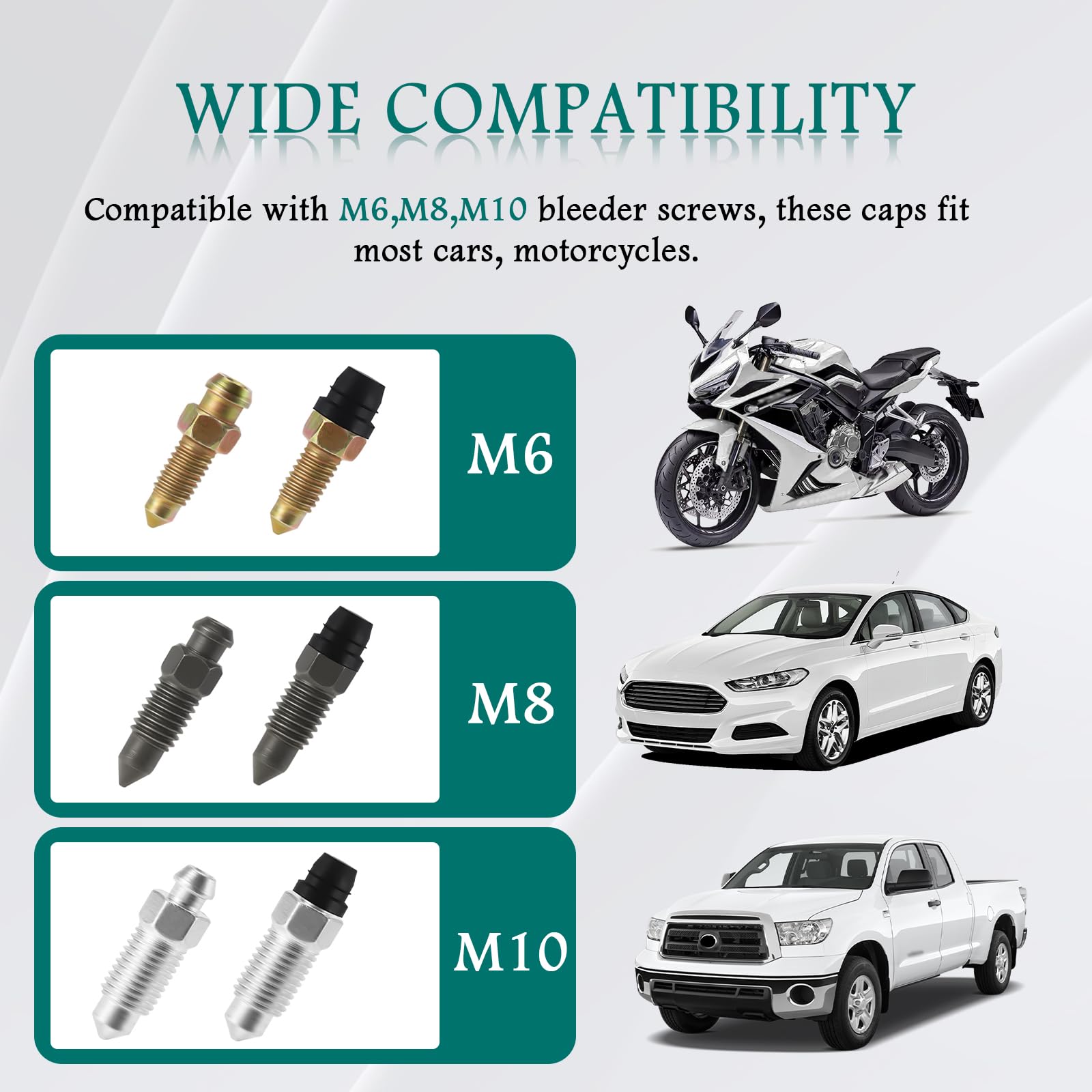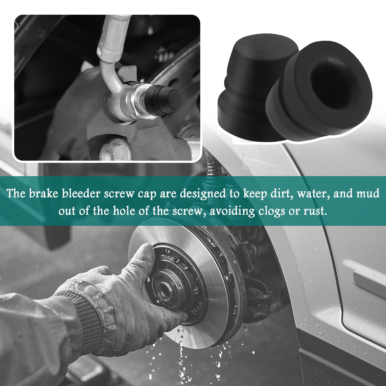 The brake bleeder screw cap are designed to keep dirt, water, and mud out of the hole of the screw, avoiding clogs or rust. By protecting the metal components, they help maintain your car's braking performance and keep your safety on the road
