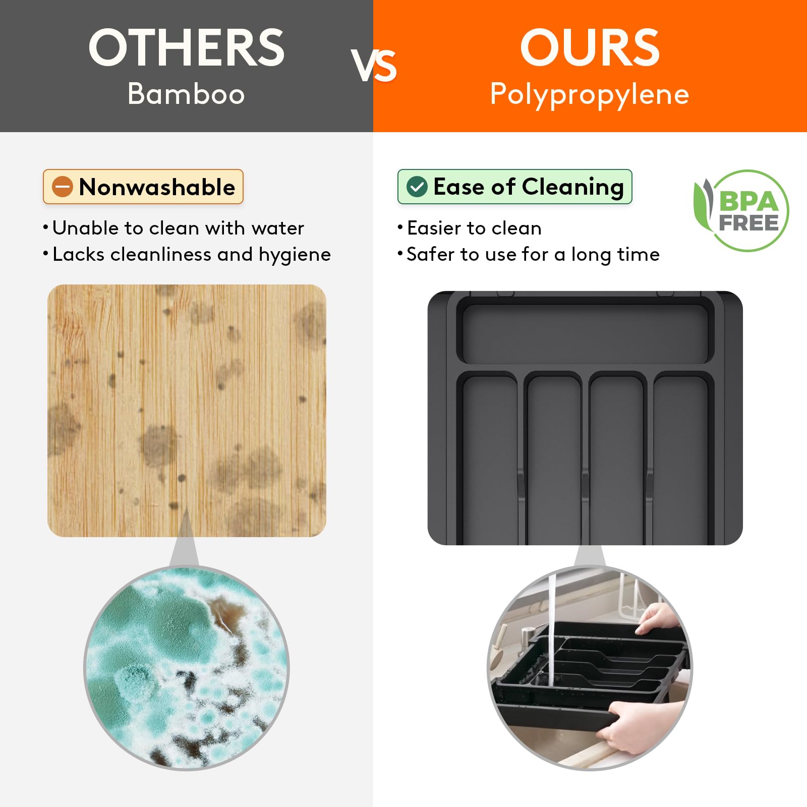 Designed with 7 compartments for easy sorting—perfect for teaspoons, forks, butter knives, and cooking accessories. We highly recommend to measure your drawer before order