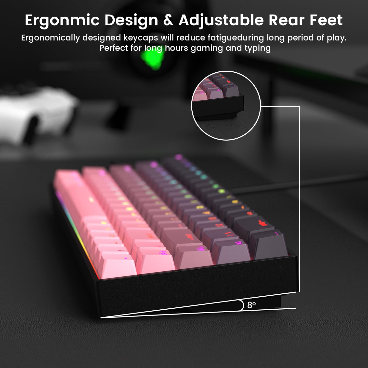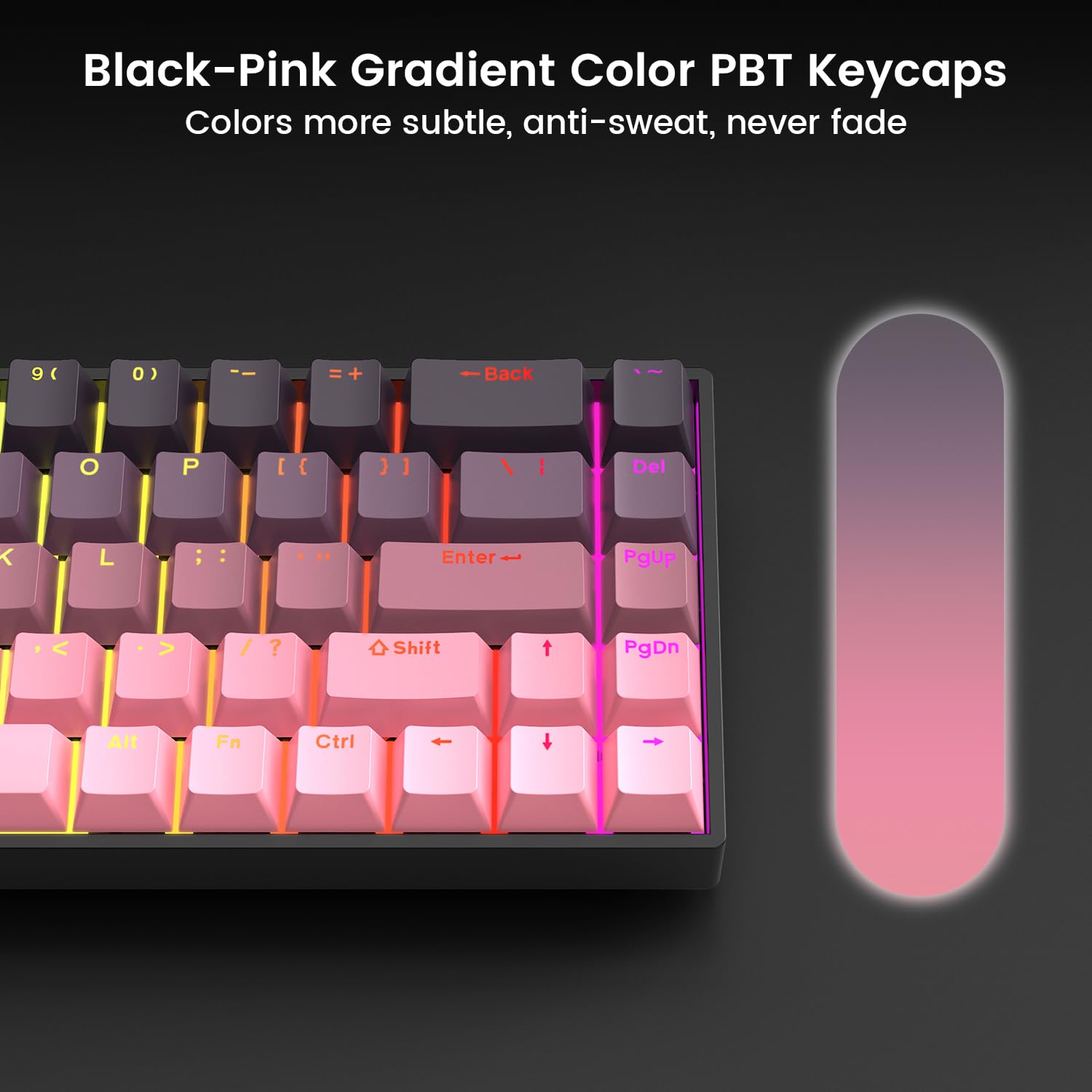 PBT keycaps on gaming keyboards are made using a double injection molding process, making them more durable, slip-resistant, and fade-resistant. The keycaps feature a gradient black-pink color scheme, with an innovative color design and color combination that creates a novel and trendy look.