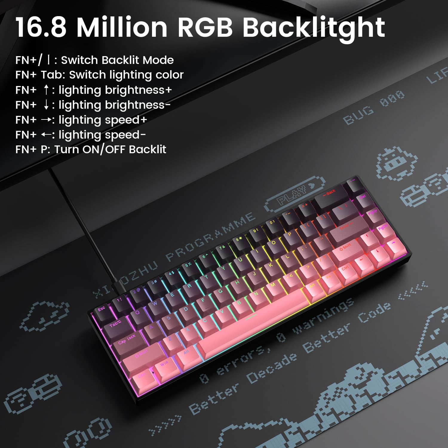 16.8 Million Colors RGB Backlit: Mechanical keyboard has 20 preset backlit effects and 16.8 million colors of RGB lighting to create an e-sports atmosphere. The translucent character design allows you to accurately press each key in the dark.