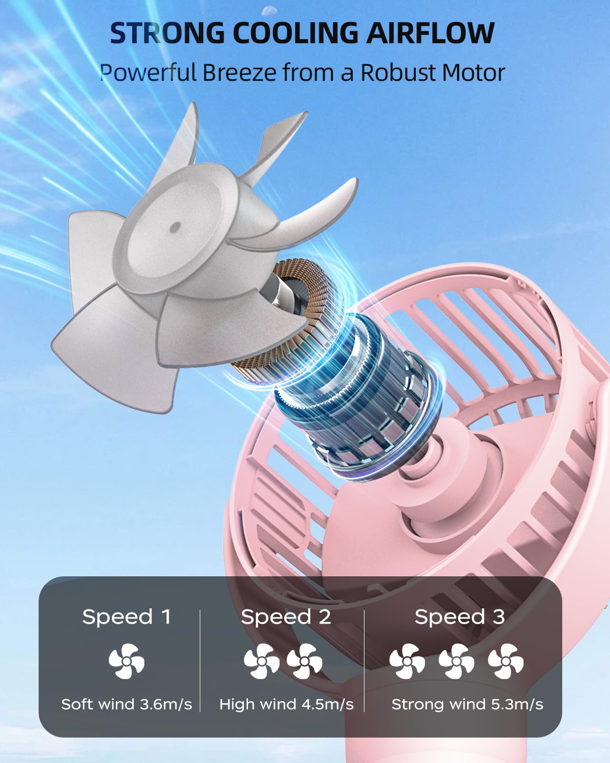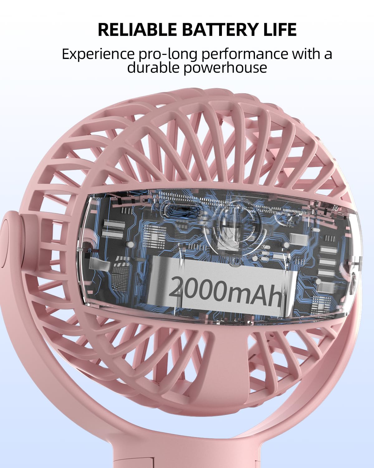 The fan is battery-powered, so you can take it with you wherever you go. It is lightweight and compact, making it easy to carry and store. The built-in rechargeable battery provides long-lasting power and can be recharged via USB.