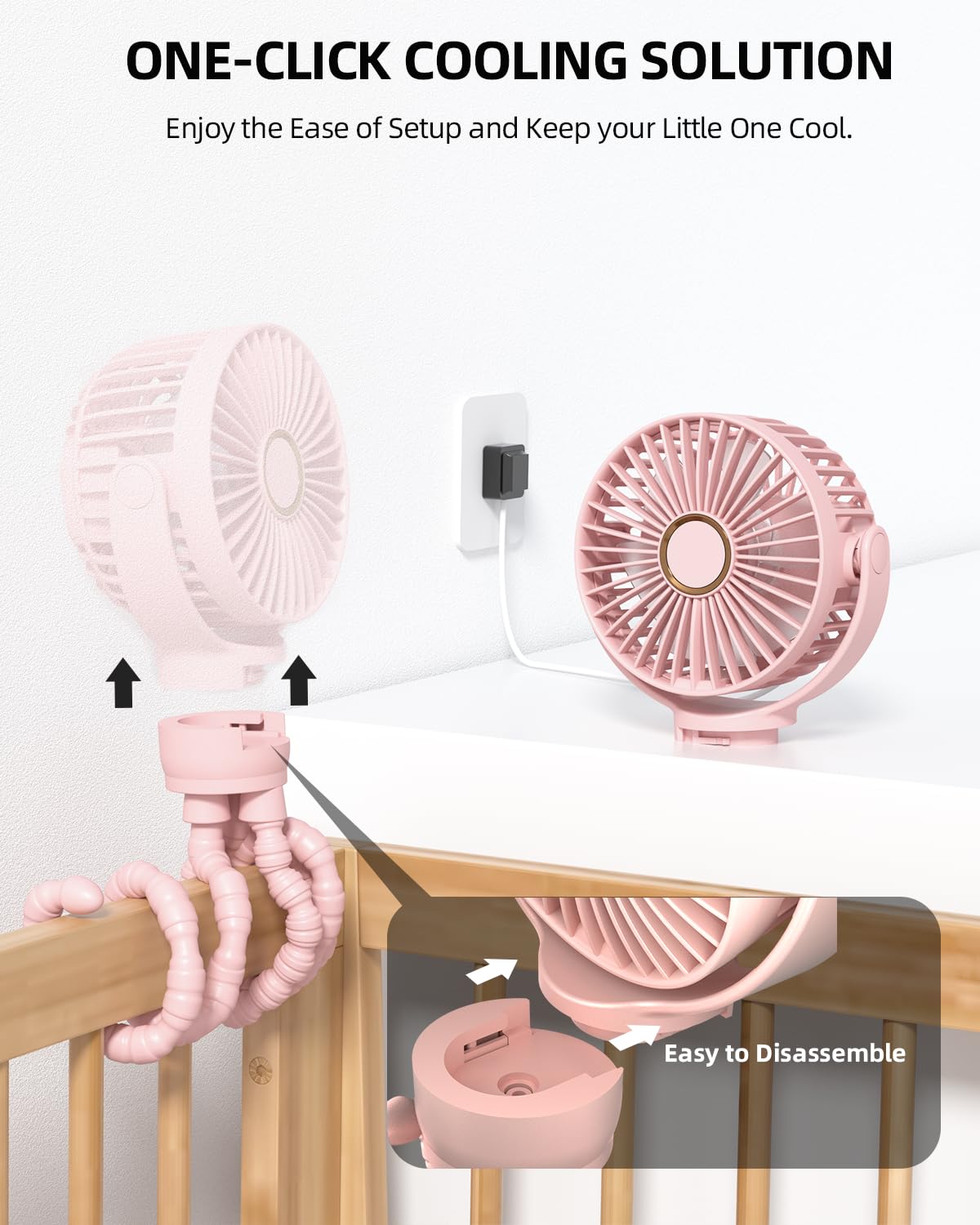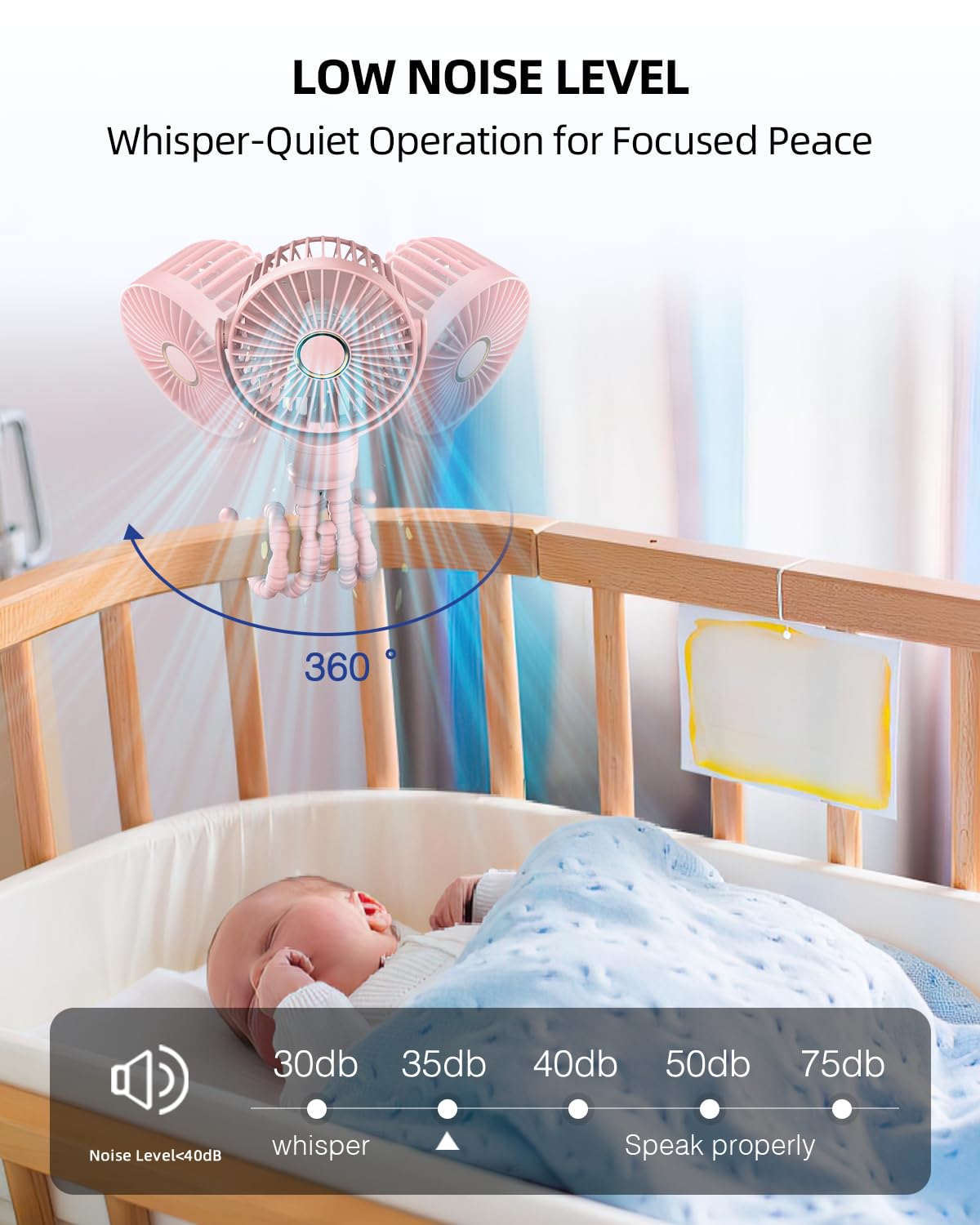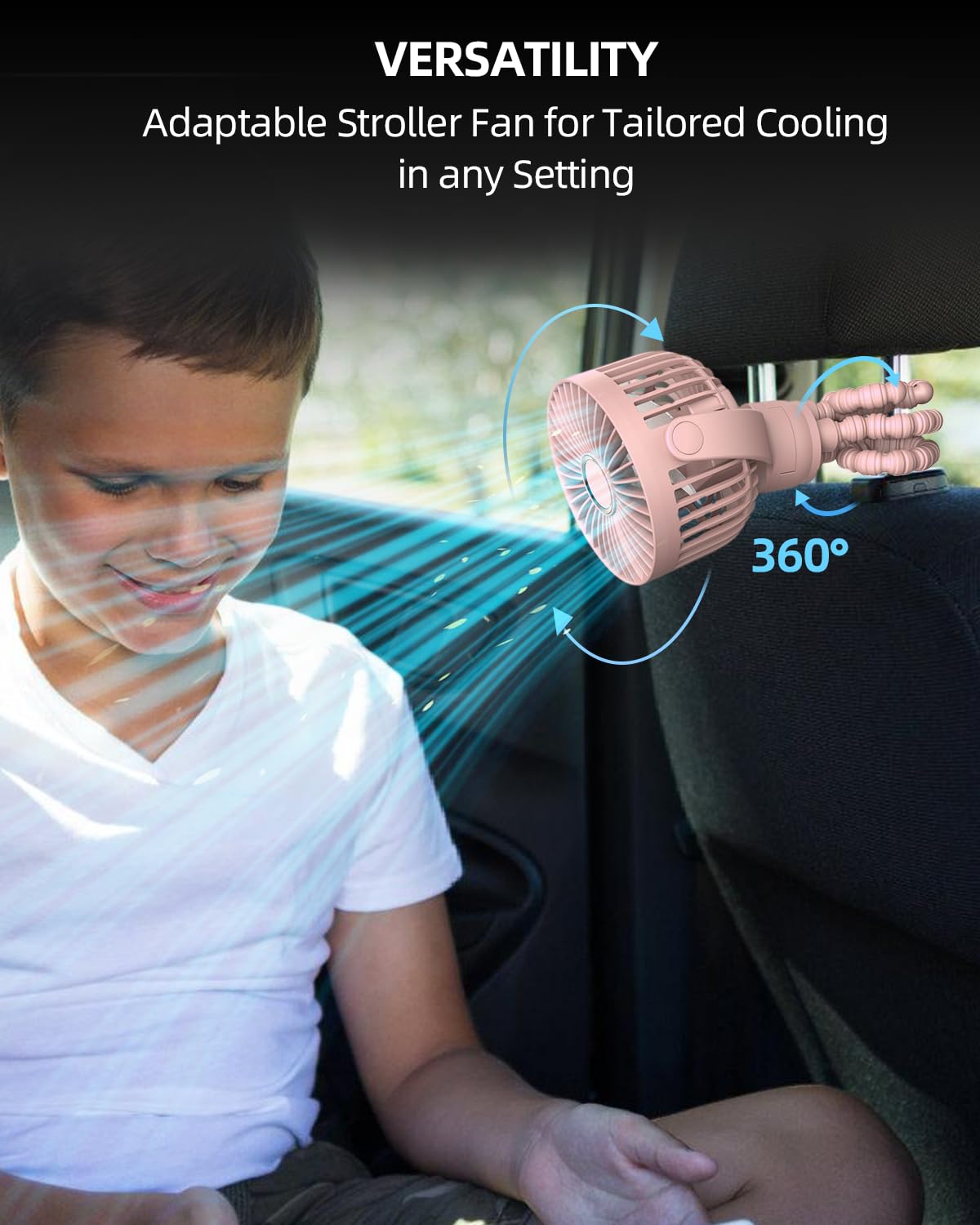 The stroller fan has 3 wind speeds (low/medium/high) and a 360°rotatable head, you can adjust the wind direction to suit your needs and keep cool in any position.