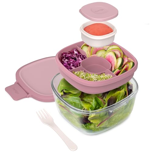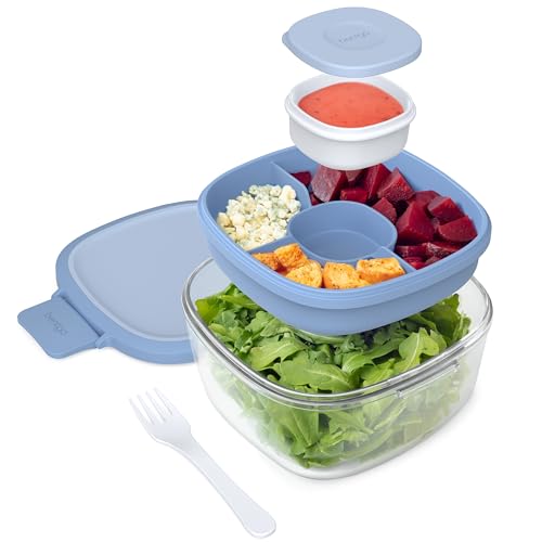 Keep salads fresh and toppings separated with a removable tray that nests in the bowl. The 4-compartment tray has a large 8.9-oz compartment & two small 4.2-oz compartments, plus a leak-proof 3-oz container & a reusable fork!