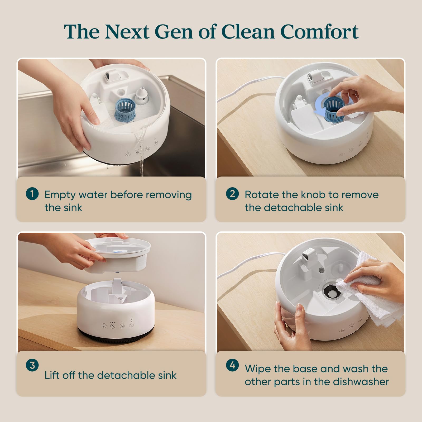 Specialized detachable sink design keeps the base dry for easy cleaning. A simple wipe of the base, then clean the rest in the dishwasher