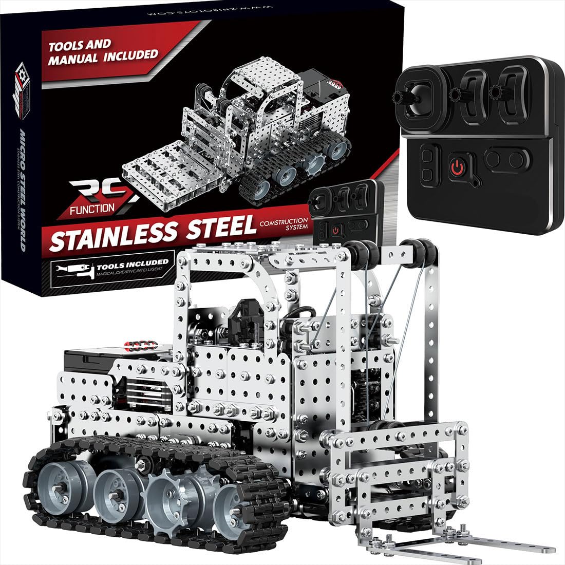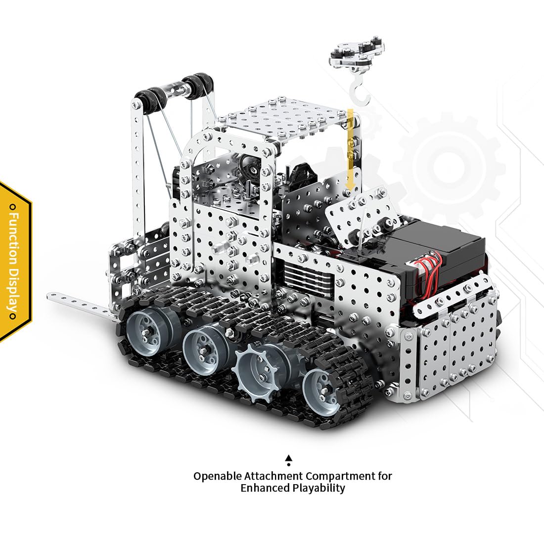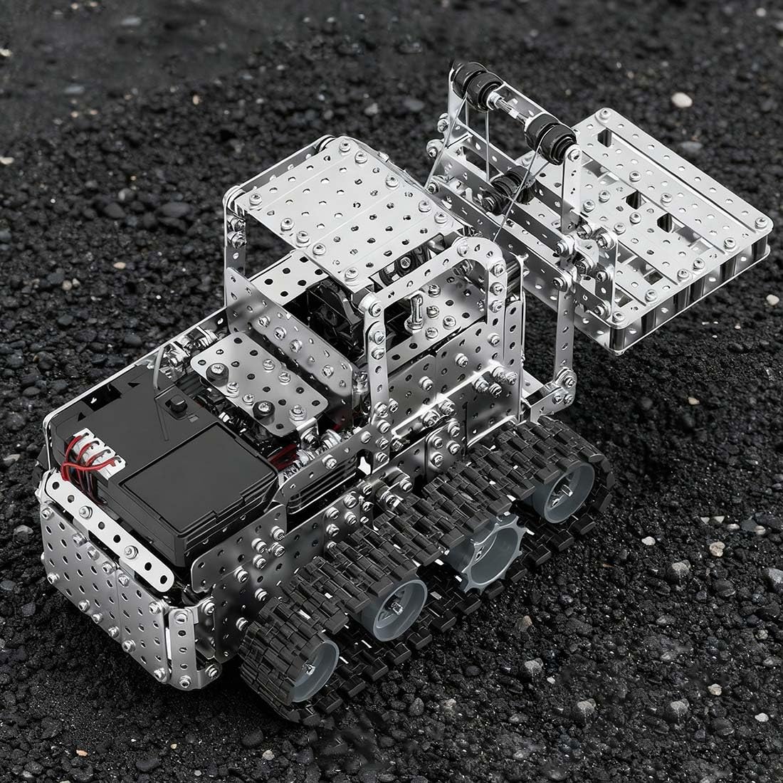 .Realistic Track and Idler Wheel Mechanism: The simulated track and idler wheel structure replicates the movement characteristics of real industrial vehicles. The compact chassis design enables flexible steering and maneuverability in narrow spaces, warehouse aisles, and on uneven terrain.