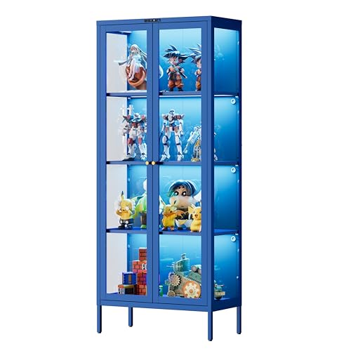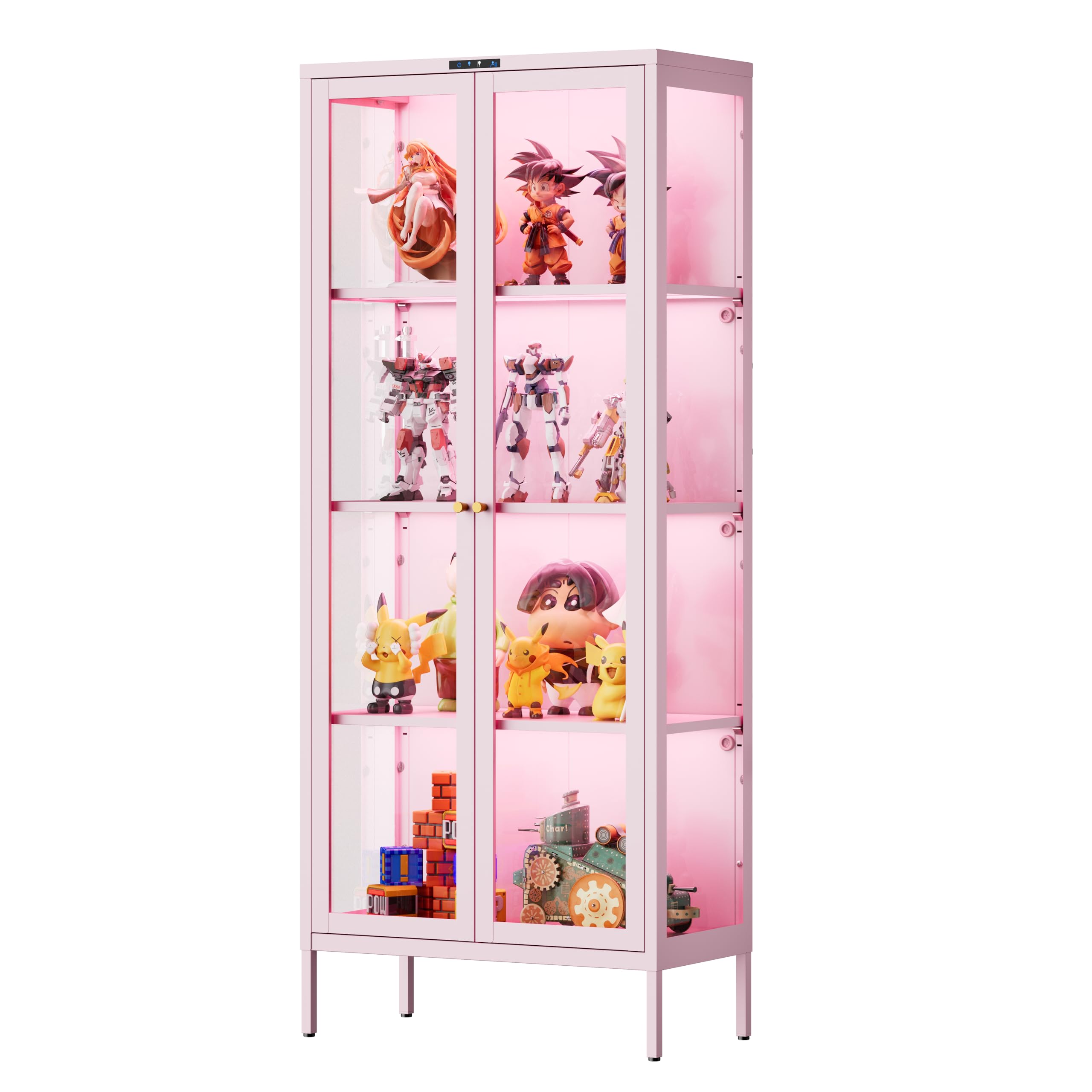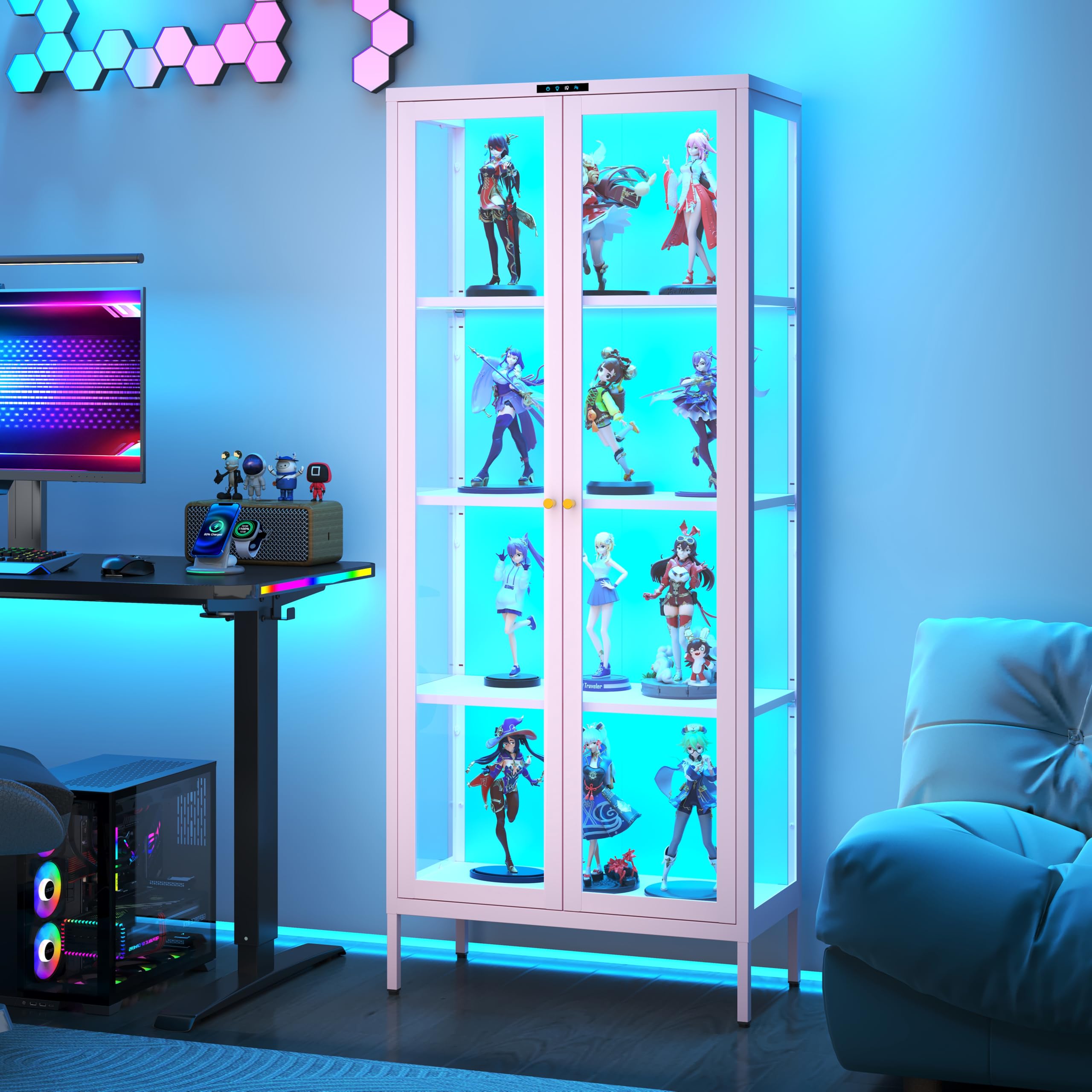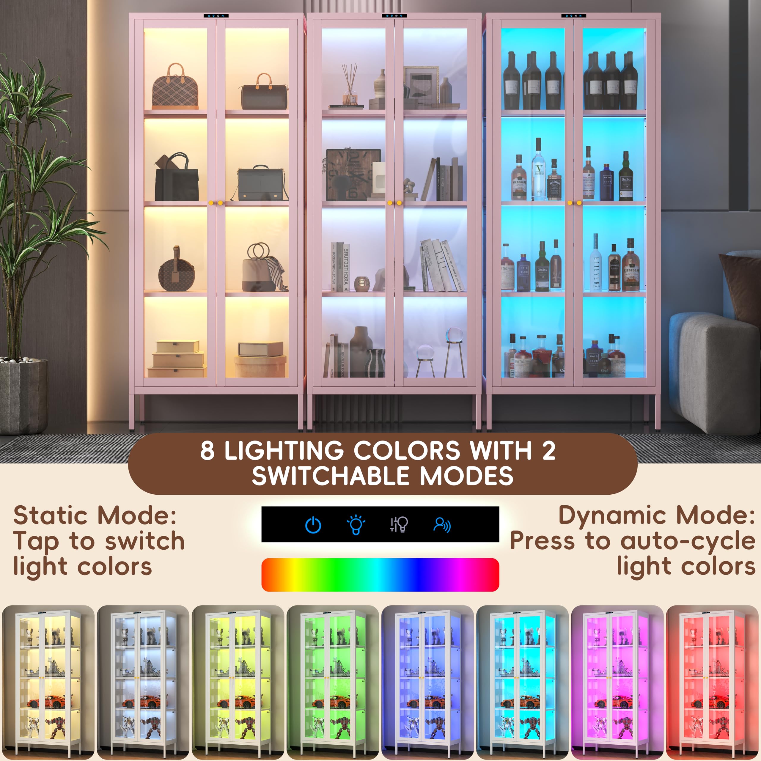 【8-Colors LED Lighting】This cabinet with glass doors is equipped with 8-color LED lights (white, warm, ice blue, deep blue, purple, green, yellow-green, red), supporting both fixed single-color and cycle flash modes. As a led display case, it evenly illuminates your collectibles, serving as a stylish lighted display cabinet that enhances the ambiance of any space